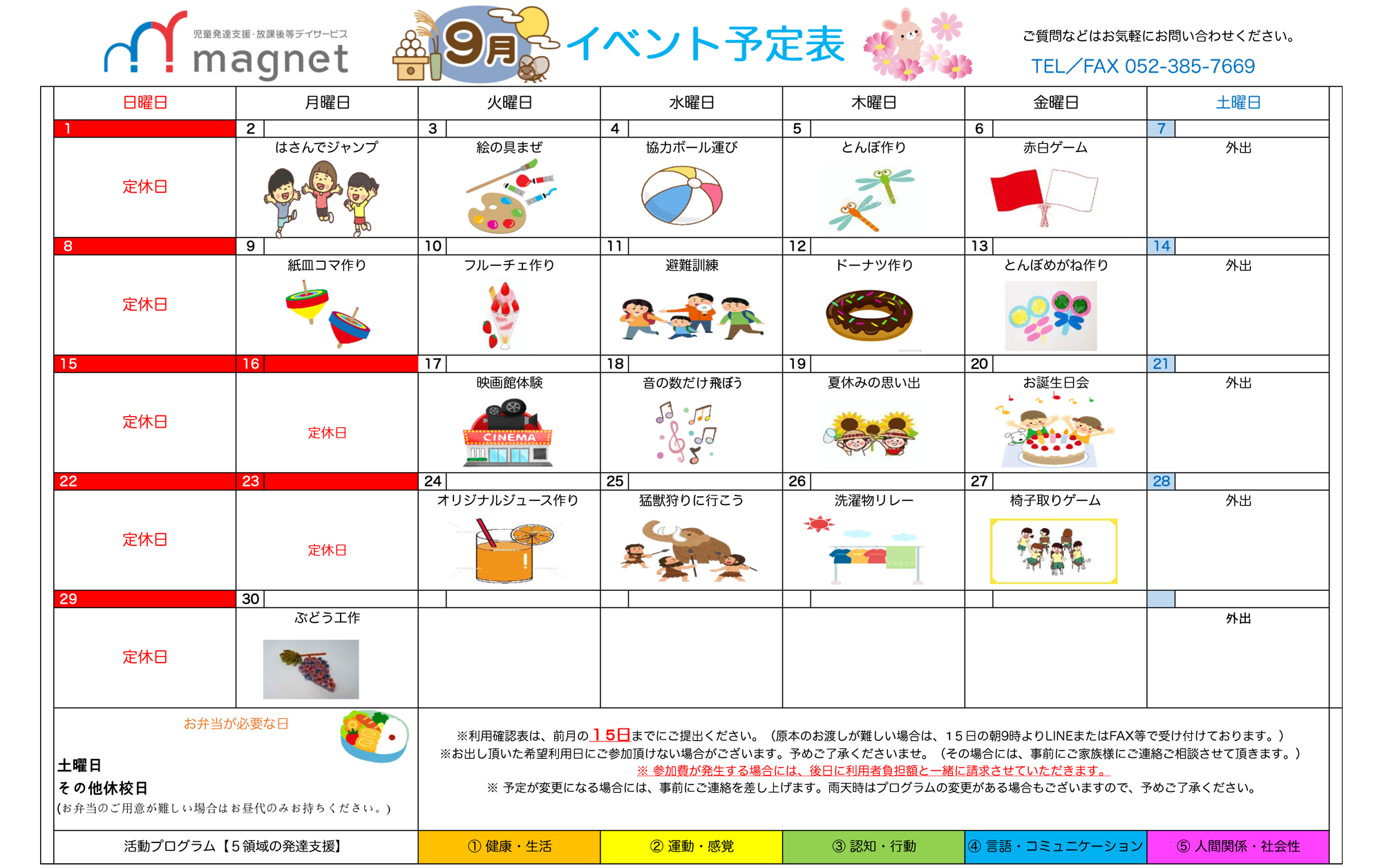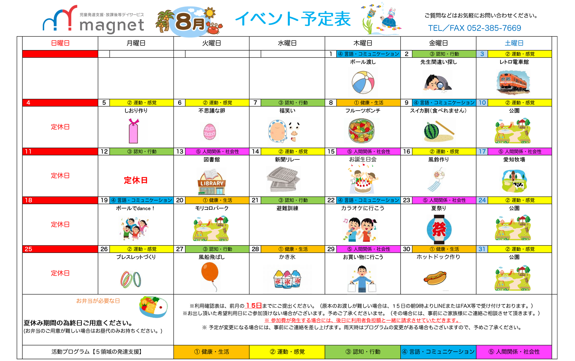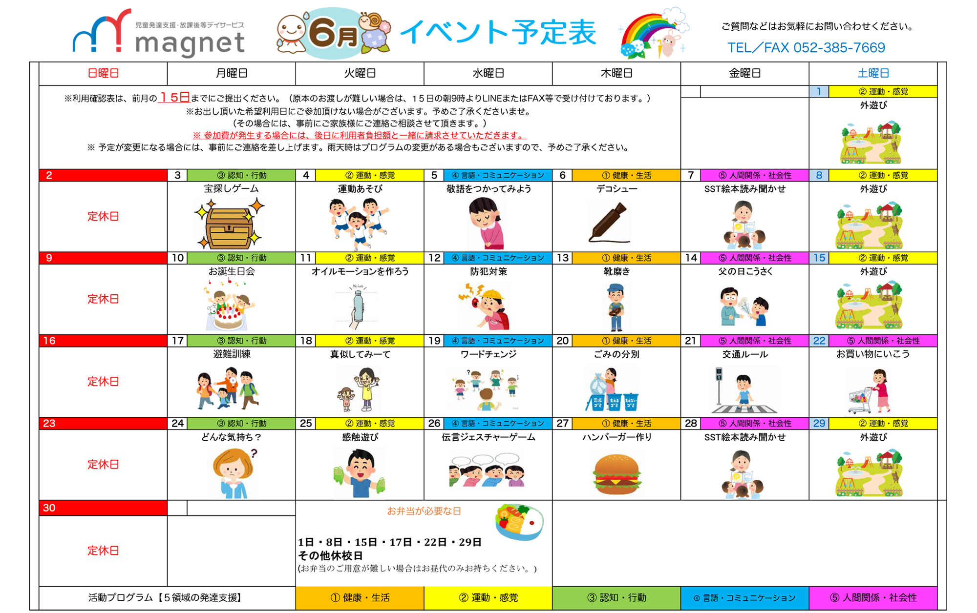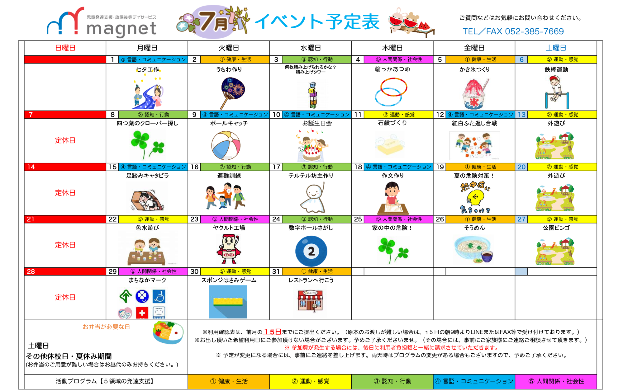 マグネットグループでは楽しいイベントが盛りだくさん! 毎月、楽しいイベントを更新中! 昼食作りやお菓子作り、レクリエーション、遠足、季節ごとの楽しいイベントなどが盛りだくさんです。 様々な学習や体験を通して、お子様達ひとりひとりの個性や能力を最大限に発揮できる環境づくりを目指していきます。 過去のイベント予定表 令和6年7月 令和6年6月