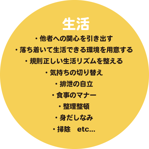 食事や排泄などの「生活」、身体能力を高める「運動」、挨拶・会話・マナーなど社会的に充実した生活のための「ソーシャルスキル」、読み書き算数を始めとする「勉強」、などの各面について、総合的に発達を促していきます。