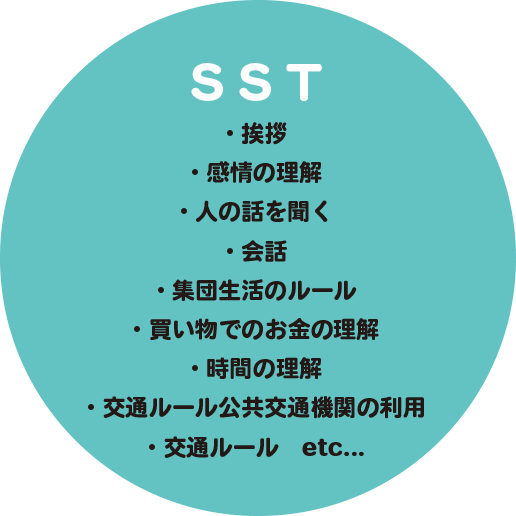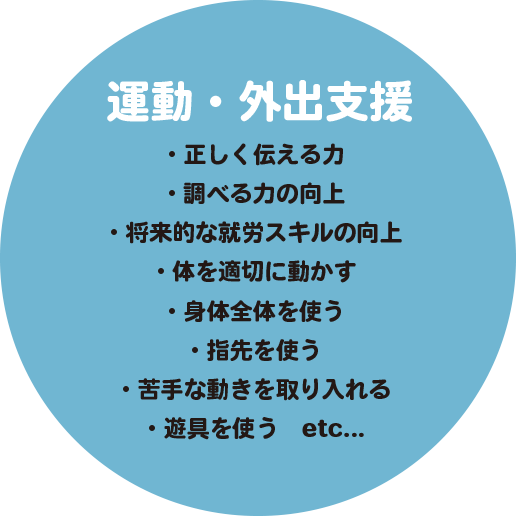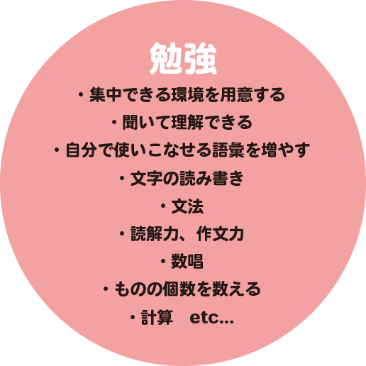 食事や排泄などの「生活」、身体能力を高める「運動」、挨拶・会話・マナーなど社会的に充実した生活のための「ソーシャルスキル」、読み書き算数を始めとする「勉強」、などの各面について、総合的に発達を促していきます。